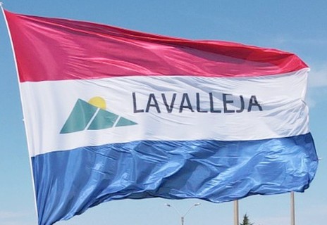 There are two primary variants of the flag: one with text that is centered on the Y-axis and another that isn't. Across versions of the flag, the font and hill size can also differ. The flag was adopted officially through Decree Nš 822 on 12 December 1990, of which the design came from a contest. The designer is unknown. The flag features three horizontal bands of red, white, and blue reminiscent of the flag of the Orientals led by Juan Antonio Lavalleja during the fight for independence. In the center slightly to the left, a green triangle with two white lines through it is seen, a representation of the Cerro Arequita hill. Behind it, the Sun of May can be seen shining and is a national symbol. To the right, LAVALLEJA is read in black.