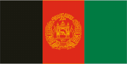 The flag of Afghanistan is tricolor (black, red and green) all pieces joined together vertically from left to right in equal proportions; the breadth of each strip equalling half of its length, having in the middle the insignia of the mehrab (an arch in a mosque where the praying congregation stands, facing the Kaaba in Mecca) and the mender (a many tiered pulpit placed to the right of the mehrab in a mosque, from which addresses are delivered) in white, flanked by two flags and ensconced in two sheaves of wheat.