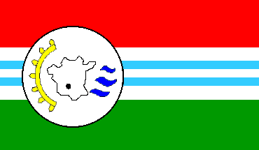 slightly higher than the "national flag". There is a white disk placed closed to the hoist, charged with a map outlined in black and with a black dot, a yellow device on the left of the map and three blue waves on its right.
