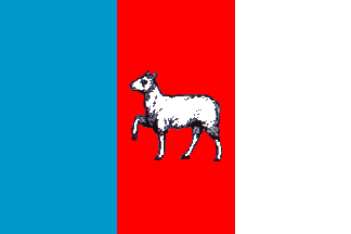 the flag is vertically divided celestial blue-red-white with a white sheep in