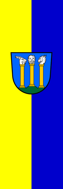 | Description of arms (German): | In blauem Schild auf grünem Dreiberg drei goldene Säulen, deren Kapitelle mit silbernen Tierköpfen besetzt sind: 1. Ziege, 2. herschauender Löwe, 3. Esel; die Köpfe von 1 und 3 sind dem Löwen zugewandt. [1] [2] [3] |