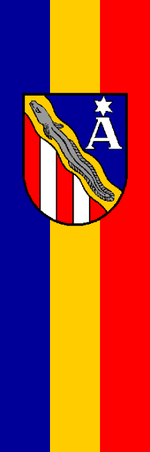 Description of arms (German): Von Blau und Rot schräg geteilt durch einen goldenen Wellenbalken, darin ein schwarz-grauer Aal; oben ein silberner, von einem ebensolchen Stern überhöhter Antiqua-Versalbuchstabe A; unten zwei silberne Pfähle.