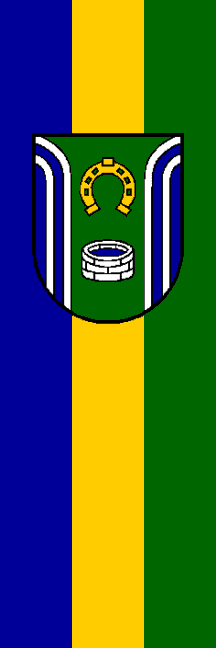 Description of arms (German): Zwischen zwei je dreimal von innen nach außen von Silber und Blau gespaltenen, oben auswärts gebogenen Flanken in Grün über einem silbernen, gequaderten und blau gefüllten Brunnen ein goldenes Hufeisen.