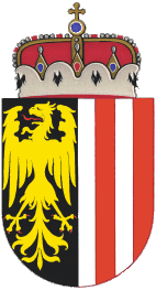 The coat of arms of the "Bundesland" (federal state) Oberösterreich is a shield with, on the left, a golden eagle armed with red tongue and red claws on a black background. On the right it is divided three times in silver and red. The shield has on the top the archducal hat of Austria.