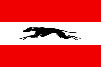 The flag of Damme is horizontally divided red-white-red with a black greyhound in the middle of the white stripe.