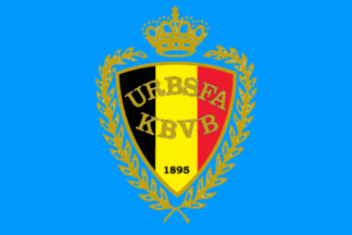 The Royal Belgian Football Association (in Dutch, Belgian Koninklijke Belgische Voetbalbond; in French, Union Royale Belge des Sociétés de Football Association; in German, Königlicher Belgischer Fussball-Bund; website) has a bright blue flag with the association emblem in the middle.