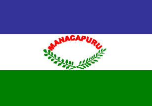 A red-white-green horizontal tricolor with two crossed green branches and the name Manacapuru arched in red letters on the white stripe.