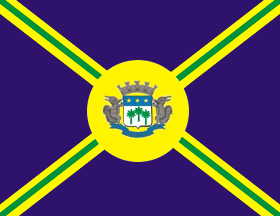 A green saltire, bordered yellow, on a navy blue field, with the municipal arms on a central yellow disk.