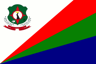 Four rays radiating white (wider), red, green, blue, with the municipal arms in the upper hoist on the white ray.
