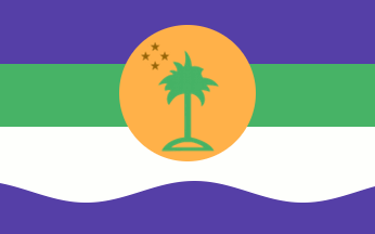 Four horizontal stripes, blue-green-white-blue, with the field boundary between the lower two stripes being wavy, over the top three stripes a centrally placed orange disk with a green palm tree on an island and four stars of the Southern Cross above it.