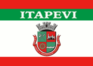 The flag of Itapevi is white with a thin horizontal red stripe at the top and the bottom, a thin horizontal green stripe just below the upper red stripe, inscribed with "ITAPEVI" in white letters, and the municipal coat of arms in the white field.