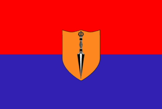 A horizontal bicolour (red, blue) with a black ritual dagger in an orange
