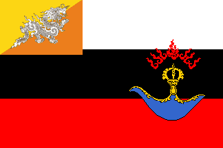 A horizontal bicolour (blue, red) with a yellow vajra in a dark red