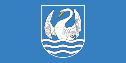 Flag is blue with a white-edged blue shield bearing the arms, a swan rising from the water.