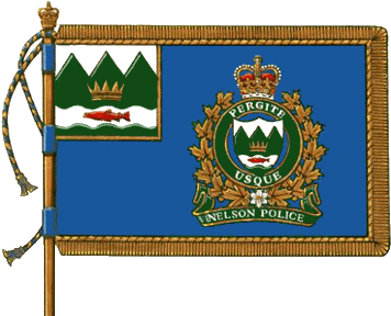 An image located by Vanja Poposki, 10 July 2013 from http://www.waymarking.com/waymarks/WMH8XR_Flag_of_the_City_of_Nelson_Nelson_BC shows a bottom blue stripe bearing the name, and two green triangles on either side of the arms.