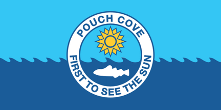 The flag of the Town of Pouch Cove, NL, is horizontally divided in waves lighter blue over darker blue with modified town emblem on it https://www.facebook.com/photo/?fbid=528727900626220&set=g.4585782397