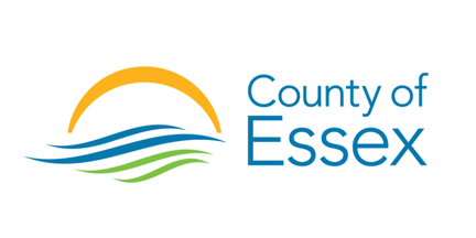 of three vertical stripes of blue-white-blue with county emblem in the middle of