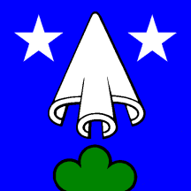 Azure a Ploughshare Argent between two Mullets of Five of the same in Chief