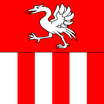 Per fess Gules a Crane rising Argent and Pally of Six Argent and Gules.