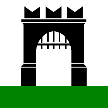 Argent a gate embattled fourché with portcullis Sable issuant from a base Vert.