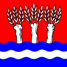Gules three Willows Argent issuant from a Base wavy Azure and on it a bar wavy of the second.