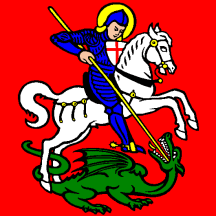 Gules St George Proper harnysed Azure with shield Argent crossed of the First nimbus and lance Or on a