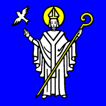 Azure St. Remigius clead argent blessing with his dexter and holding