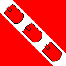Gules, on a Bend Argent three Shovels bendwise Gules.