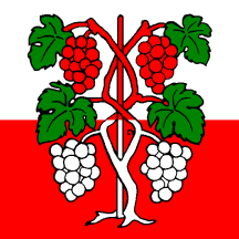 Per bend Argent and Gules issuant from a base Vert a vine tree of the Same fructed of the First and