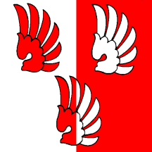 Per pale Argent and Gules, three Wings two and one counterchanged.