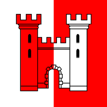 [Shooting Club Flag (Société de Tir de Vevey et La-Tour-de-Peilz, b/w photo). 218x210 cm. Blue cross traversante, blue and white flames. In the center a rifle crossed with a rifle fork, surmounted by a golden crown, below them the inscription "1643". Around and above the devices a ribbon with the words LUDO | CONCORDIAE | BELLO (for the game | for the concord | for the war). Below the central devices another ribbon with the initials D D C. Below this ribbon the letters V V intertwined (cf. communal flag of Vevey). Obverse and reverse are identical. (source: [b7b42])]