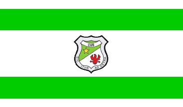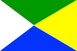 The flag of Institución Educativa Municipal Integral del Sumapaz, a school located in Fusagasugá (Cundinamarca), is blue with a white triangle spreading from the hoist to the mid-fly, itself charged with a green triangle placed along the hoist and with the school's coat of arms.