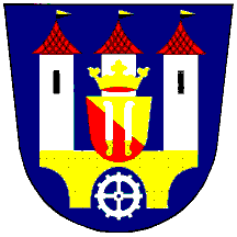 There is a photo of the Coat of Arms: azure a bridge or, arched 3x, surmounted
