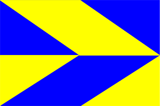 Flagdescription: two equal stripes blue, yellow, with on each stripe a parallellogramme countercharged of 1/2 flaglength, reaching from fly to hoist.