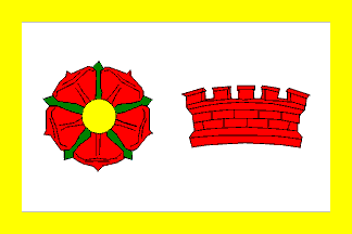 Flag: white bordered yellow; at the hoist a red flower; at the fly a red mural crown.