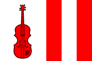 This one is canting; "housle" is "violin" in Czech. Blazon: Per pale, argent, a violin in pale gules, and gules, a pale of the field.