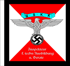 A square white flag with a wide red stripe diagonal lower left to upper right, with a black border. Slightly above the center, the NSKK insignia (a silver party type eagle holding a silver wreath with a black swastika, above a light blue ribbon with the letters "NSKK"). Below the insignia, the silver letters "Korpsführer". (I am a bit uncertain as to whether the silver may not be a very pale blue).
