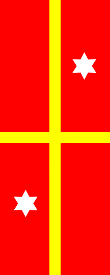 It is a yellow-blue vertical bicolour. The coat of arms is in a bannerhead quartered of yellow and blue.