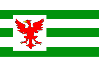 Seven horizontal stripes, white-black, towards the hoist a white square field 3/7ths the height with a red eagle (without crown or regalia).