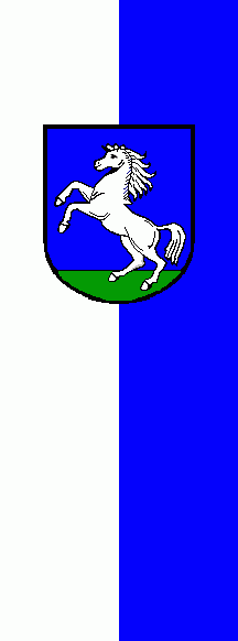 It is a white-blue vertical bicolour. The coat of arms is shifted to the top.