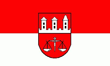 It is a red over white horizontal bicolour. The coat of arms is shifted to the hoist.