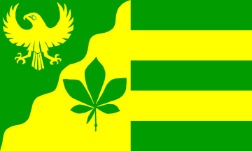 The ratio is 3:5. It is green - yellow- green vertical triband with ratio approx. 1:2:1. In the yellow stripe is a black harrow topped by two green branches of oak, each with one leaf between two acorns of the same colour.