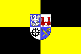 It is a black-yellow-black vertical triband with ratio of stripes 1:4:1 and coat of arms shifted towards the top in the yellow stripe.