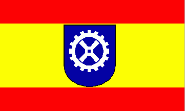 n a silver field is a red radiant sun with a silver(=white) capital "H" in its centre.The shield has a plain black base and a red chief showing a silver(=white) gear flanked by two ears of grain of the same colour.