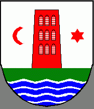 In a silver (=white) shield is the red ruin of a church tower flanked by a waning moon crescent on the dexter side and a 6-point star on the sinister side. Both elements are red. The base is green over blue and silver (= white) waves.