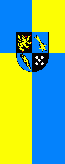 The banner is off-centred quartered of blue and yellow with arms shifted towards the top.