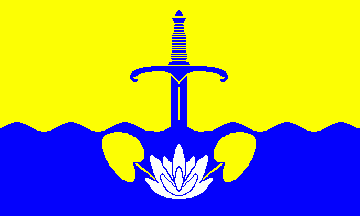 Shield parted abased per fess wavy, above Or a sword issuant Azure, beneath Azure a water lily blossom Argent between two leaves Or.