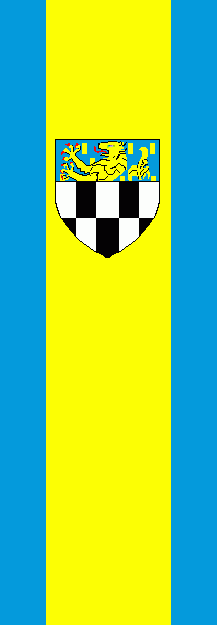 It is a blue - yellow - blue vertical triband with ratio 1:3:1. The coat of arms is shifted to the top.