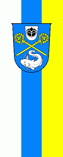 It is a white-blue-yellow vertical tricolour. The coat of arms is shifted towards the top.