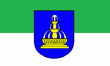 The ratio is 3:5. It is a green over white horizontal bicolour. The coat of arms is in the centre of the flag.